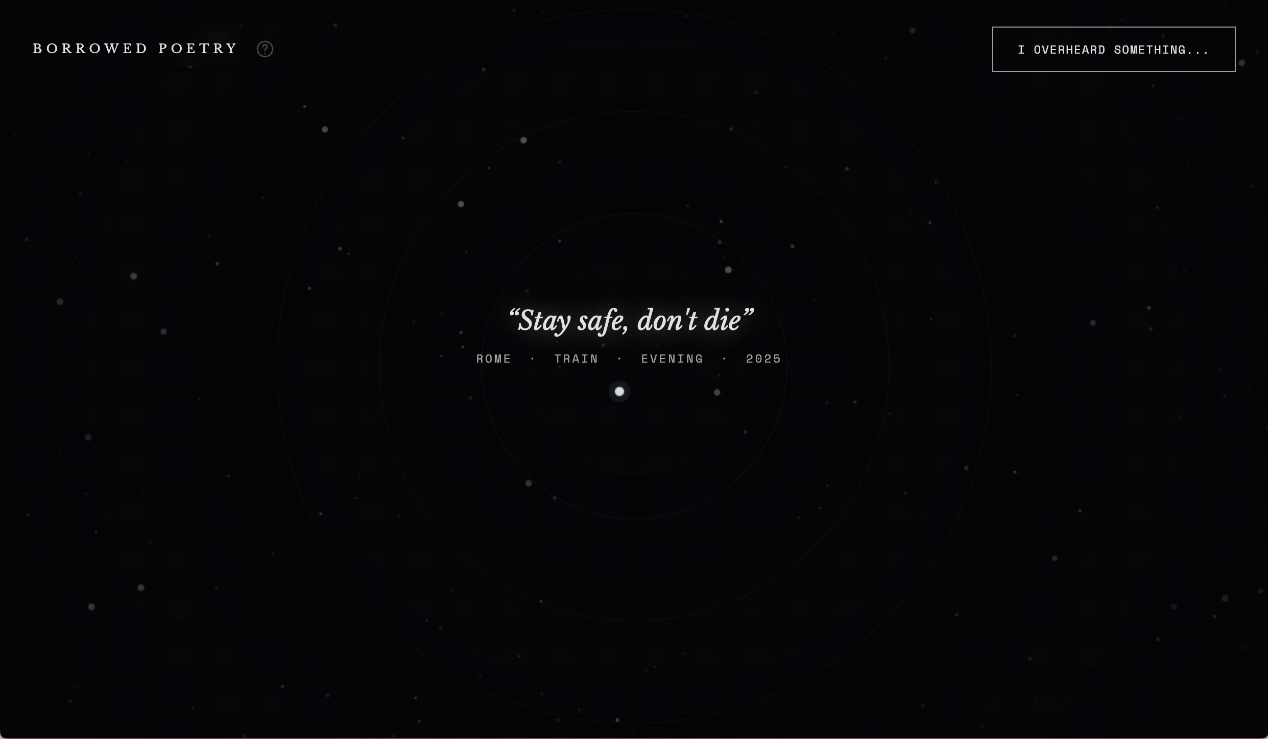 By night, I read between the lines of my own life and turn what I find into visualisations: concerts, travel routes, conversations that were never meant to be heard. I'm also trying to become a polyglot.